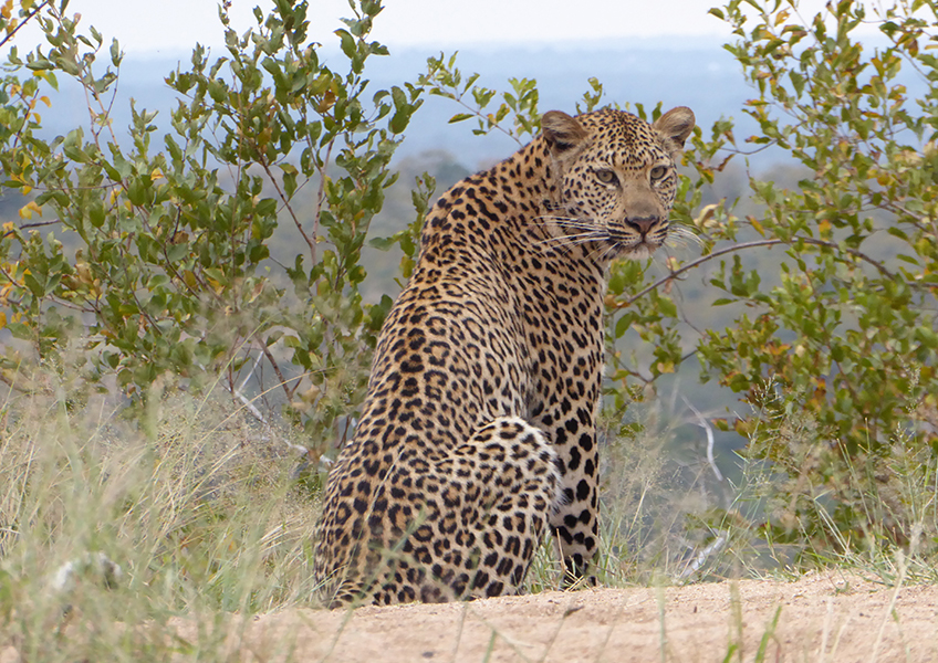 I would like to submit a photograph I took on safari in May 2018. The photo was taken whilst staying at Savannah Lodge, Sabi Sands. We had been tracking this leopard for the early part of the morning and then she had gone off into the bush. David, our guide, had decided it was time for morning tea and when we arrived at the site there she was. Obviously we did not have our morning tea at that site but spent time just sitting watching her and I took this photo of her sitting on sandy rising with the valley falling away in the background. Anne Gridley