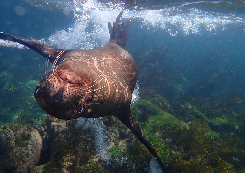 Runner Up – Gabi Warner: A peaceful early morning snorkel in the beautiful coral reefs of the Galapagos changed when a young sea lion came to play. Bursting through a tunnel of bubbles he eyed the camera quizzically and spun himself around us, following our family for an hour. True sea dogs.