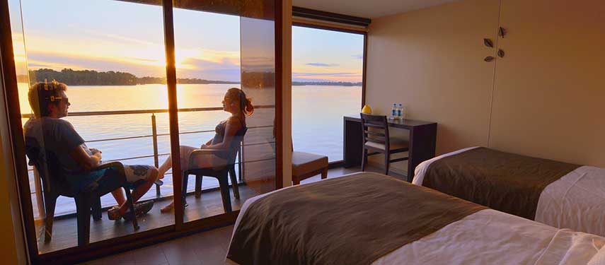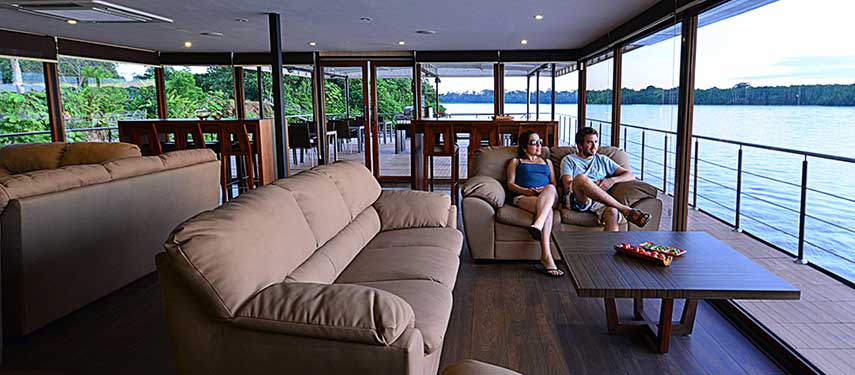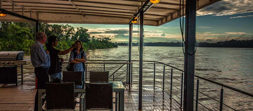 Its eighteen air-conditioned, ensuite suites feature ample sitting areas, large, comfortable beds, panoramic windows and private balconies. When passengers are not out on jungle explorations they can enjoy the comforts of the common reading room, enjoy a drink in the alfresco lounge, take a dip in the outdoor Jacuzzi or take in the beautiful scenery from the observation deck. Dine on refreshing and irresistible tropical cuisine, from adventurous Ecuadorian dishes as you share tales of your adventures with fellow guests.