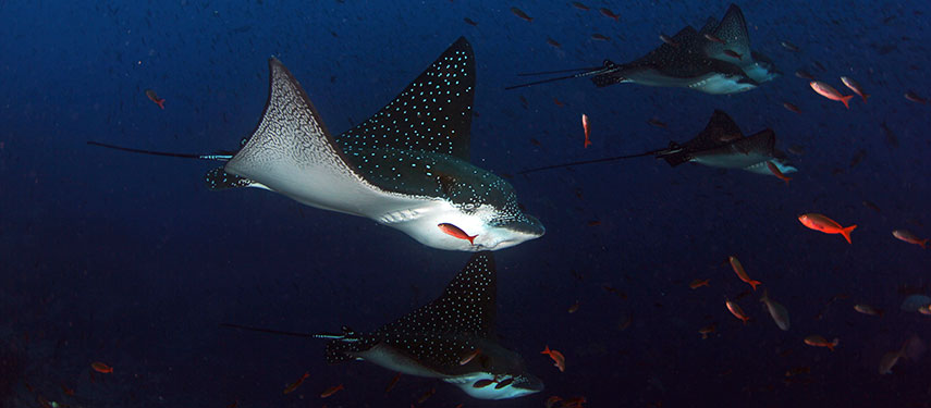 Hammerheads, hammerheads, hammerheads.  Individuals, small schools, large schools, and even the possibility of running into a solid wall of hammers! During manta season, the sharks tend to “wall up”, creating a solid school of large sharks in a very, very close proximity to each other. Manta season is also when there is a sharp increase in the sightings of all types of rays – giant mantas for sure, but also large (200-plus) schools of mobula rays, spotted eagle rays, golden rays, cow-nosed rays and marble rays.