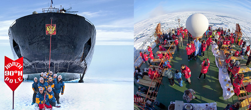 Now is the time to experiencing the long-anticipated thrill of standing at the top of the world. Join hands with your fellow passengers and literally walk around the world. You will be treated to a barbeque meal on the ice and have the chance to take a plunge into the icy water!