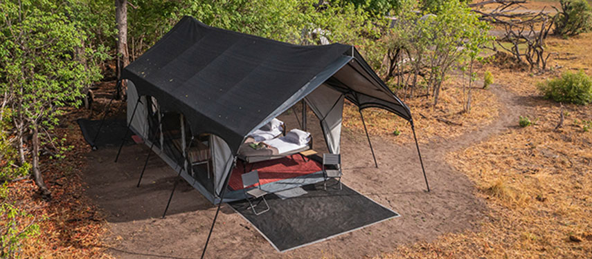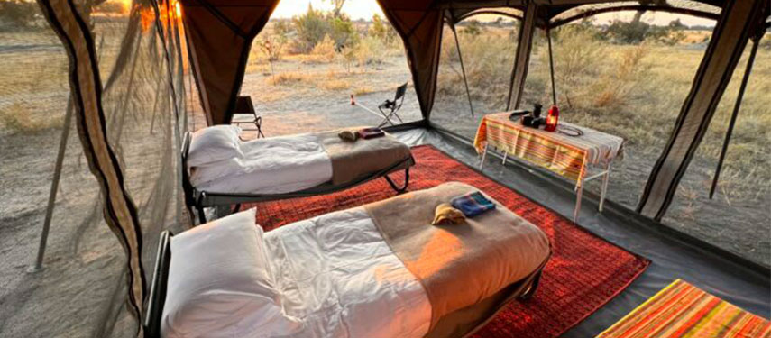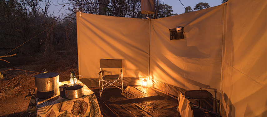 Driven by the urge to explore some of Botswana’s lesser known gems, Beagle Expeditions have designed a lightweight expedition style camp that allows guests to reach remote regions completely untouched by tourism. The tents are airy and spacious meru tents, with clear mesh that opens the tent up completely to the surrounding bush, immersing you in nature. Bedrolls are laid out on firm camp beds and made up with fine Egyptian cotton linen. The main tent includes a hanging wardrobe to unpack your belongings into and has its own en-suite bathroom with a bucket shower (for hot or cold showers), a compost loo and all the necessary amenities to ensure comfort and privacy.