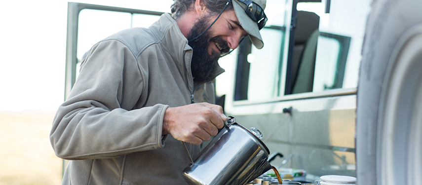 The main area is simple and yet comfortably charming. Comprising a dining table and camp chairs; a carpeted chill-corner scattered with cushions; a coffee and tea station; a bar with plenty of ice; and of course a fire at night and in the early morning! This is all set up by the backup team under the African sky and open to the surrounding wilderness and the wildlife that inhabits it.