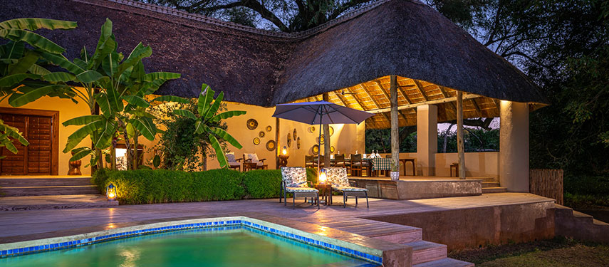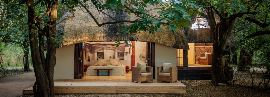 The ten bedded camp is situated opposite the Luangwa Wafwa (a game rich area of the park) in the Upper Lupande Game Management Area. It offers all the creature comforts of a lodge yet with all the intimacy, tailored activities and flexible mealtimes you come to expect from a bush camp. The camp is unique with its décor of locally crafted and handmade details. The main area is elevated between 1-3 metres on wooden decks affording great views to the park and river. The swimming pool is sunk into the deck, linked by a waterfall. Seating areas are all elevated and open plan with a bar area as well as a dining and reading area.