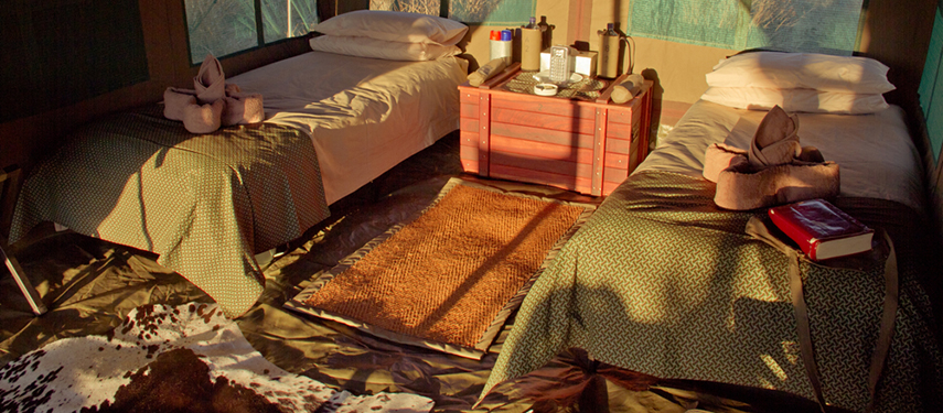 Being on a tented safari also means camp sites are chosen according to seasonal movements of game and local conditions. Each camp caters to a maximum of twelve guests to keep safaris private and personal. Accommodation consists of spacious walk in tents complete with linen and all amenities needed for a comfortable stay in the bush. Each tent has its own traditional bucket shower and long-drop loo.
