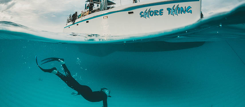 Your adventure begins as you board “Shore Thing” at the local marine facility for a 4pm departure. Enjoy a late afternoon snorkel or dive near “Five Fingers Reef” before enjoying a cool drink as the sunsets and the vessel sails to its overnight anchorage. Before the evening meal is served, have a go at fishing from the back deck, with the opportunity for a fresh caught meal.