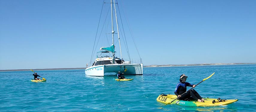 Take a leisurely kayaking trip along the secluded coastline to Pelican Point, keeping an eye out for large rays resting and turtles feeding in the shallow waters. Your crew and guides will then select the best snorkel or dive sites based on the conditions. Some of the favorite’s include “Syd’s Harbour” and “Goliath’s Den”. You seek out dugongs and dolphin’s as you travel to your evenings anchorage at Point Maud. From June – October there is a fantastic opportunity to observe Humpback Whales as they migrate along the Ningaloo Coast.