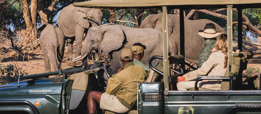 Guests and guides watching a herd of elephants from a game vehicle in Lower Zambezi National Park, Zambia.