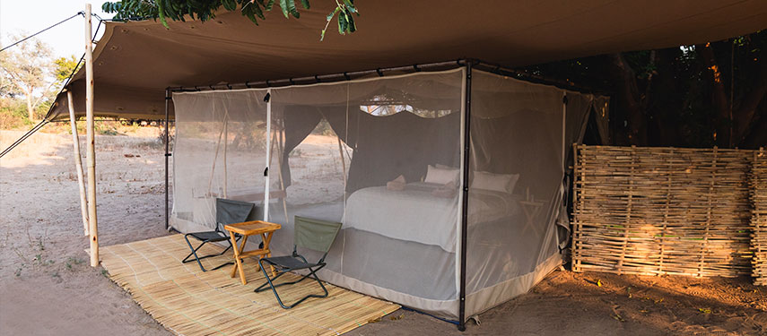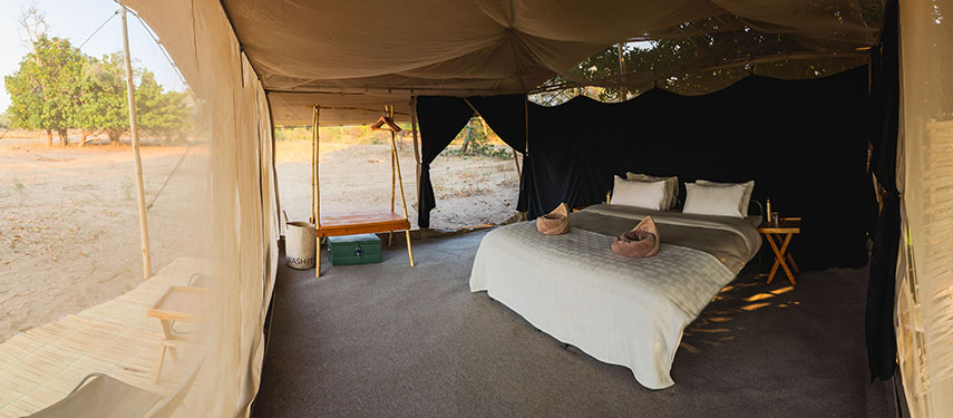 From here you’ll journey deeper into the park to spend three nights at Chula Island Camp. Set on a private island within the Zambezi, Chula offers a wild and remote atmosphere. Here, boat safaris and fishing excursions allow you to explore the river, while walking safaris reveal hidden corners rich with birdlife and game. Nights are spent around the fire under star-studded skies, accompanied by the sounds of the bush.